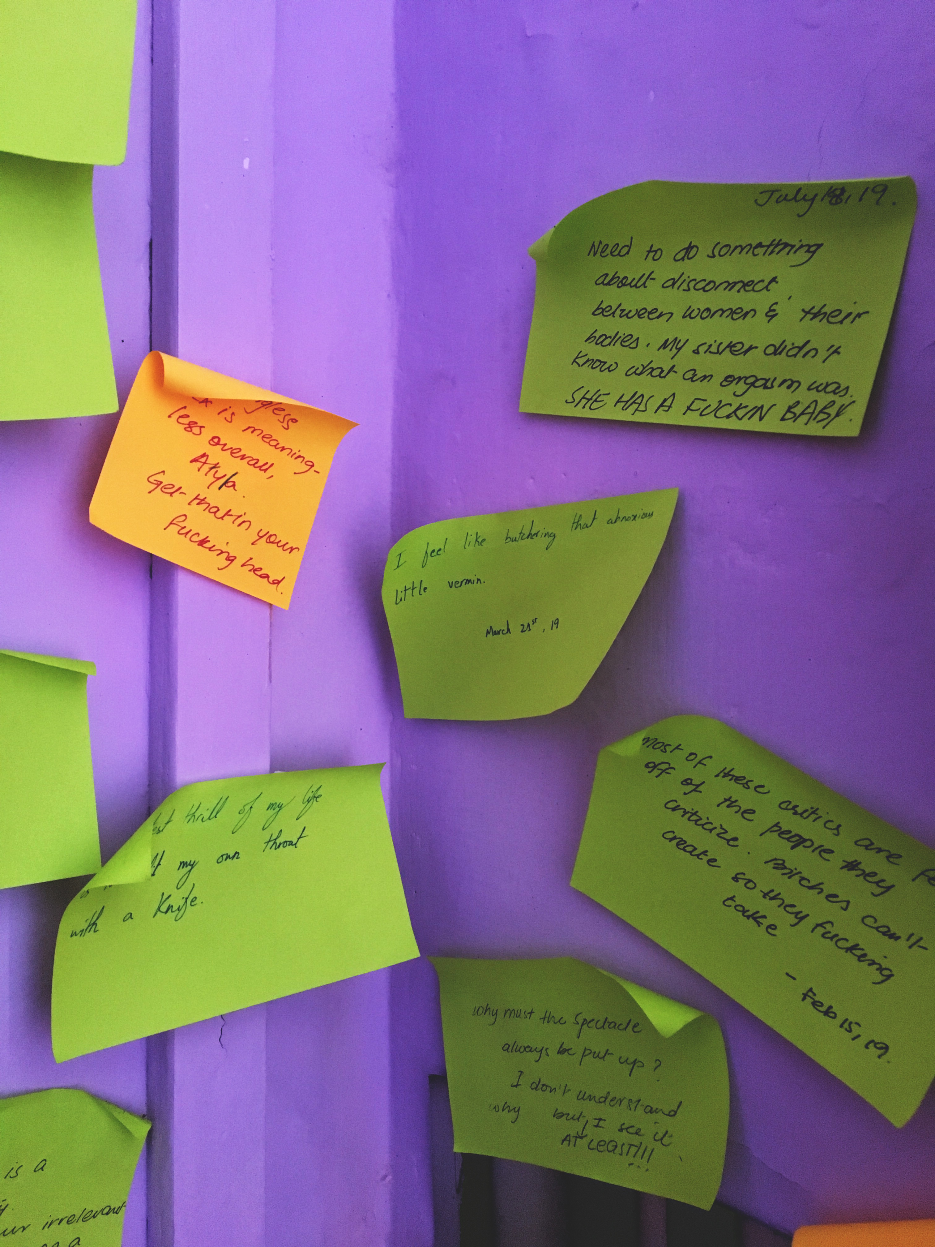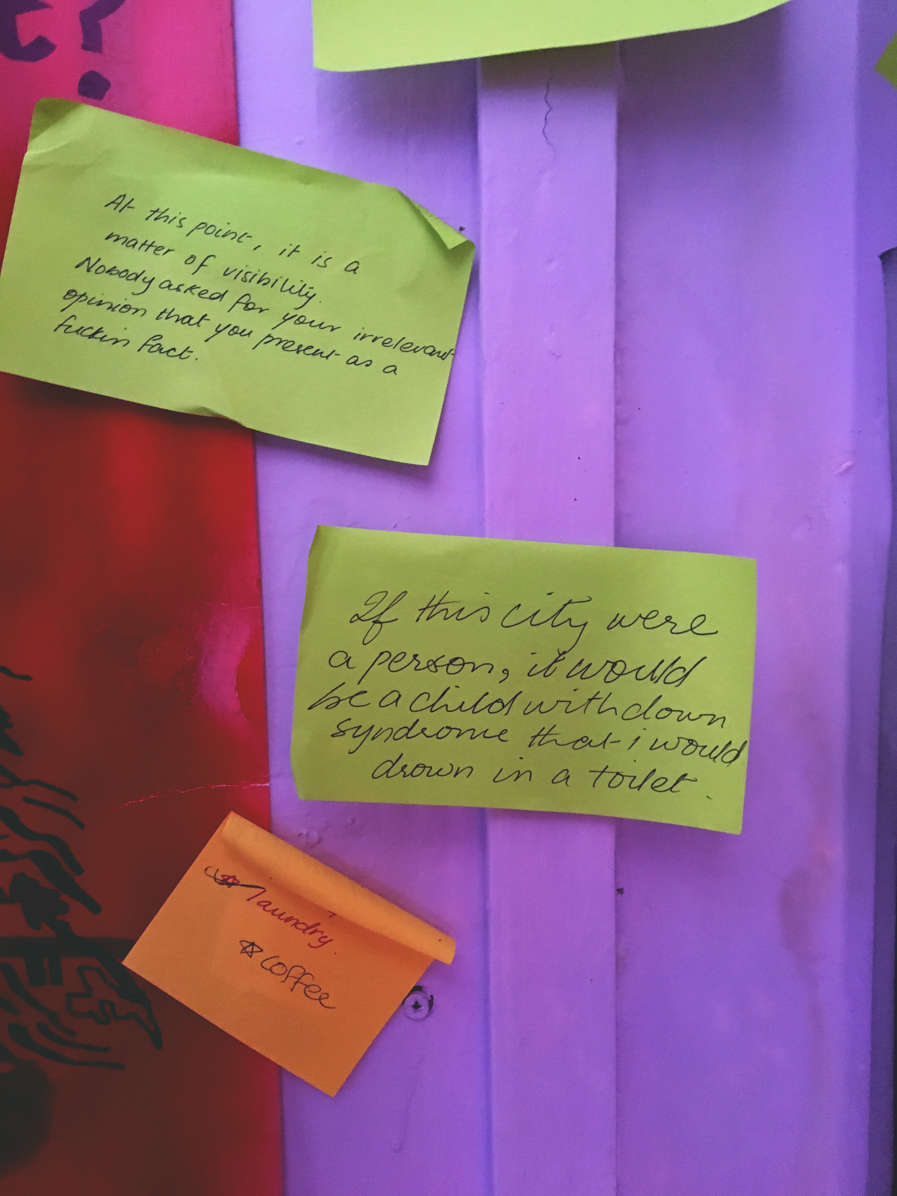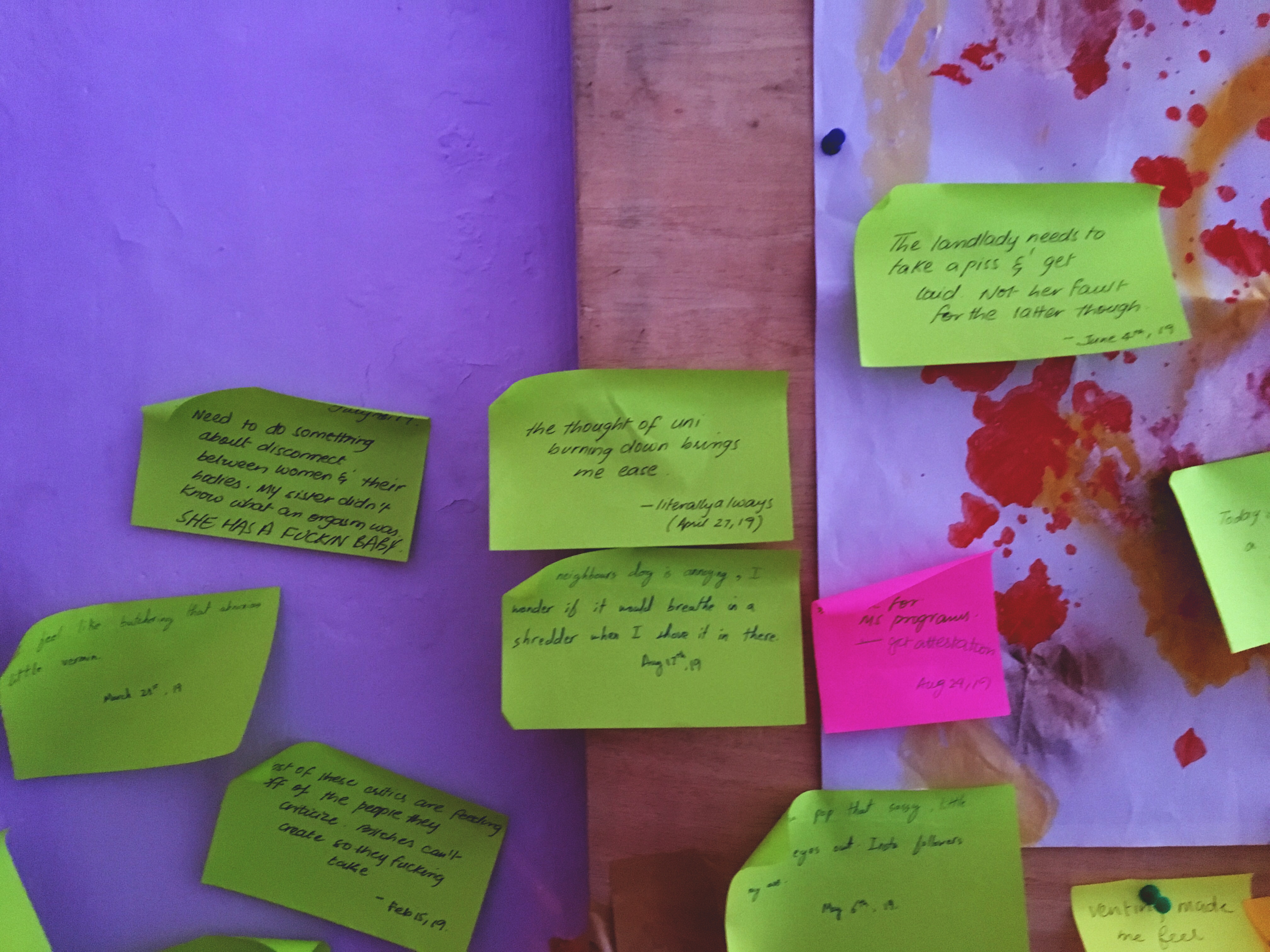 Upon entrance, people could use visual cues in order to understand a range of information about the character including factors such as gender, age, name, to quirky habits, lifestyle choices, fincancial constraints, romantic conflicts, etc. Sound pieces were installed in multiple locations within the room (hidden) to capture the usual sounds a person living in the space would be exposed to; they included: sound of windchimes near the window; muffled noise of people yelling across the hall; construction noise; call for prayer in the neighborhood; etc.
